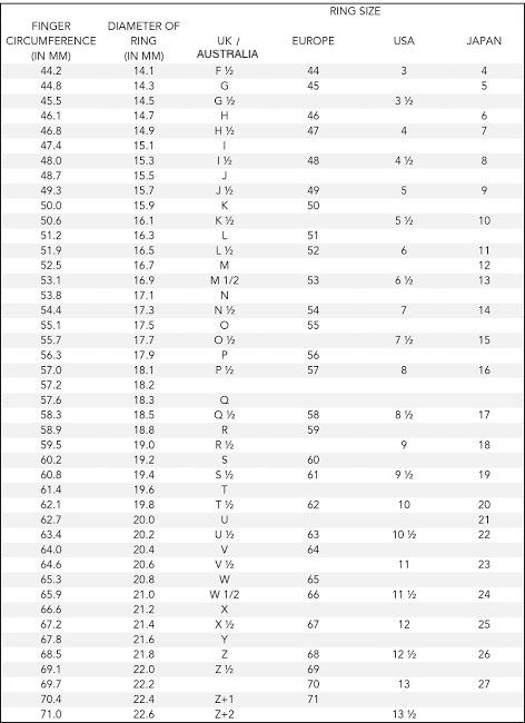 If you're unsure of your ring size, the easiest way to measure it is to take a ring that fits you and measure the inside diameter with a ruler. The measurement must be taken from the inside edges of the band- not including the band.